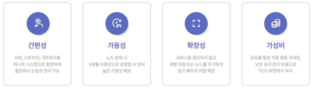 | 스토리지 | SSD/M.2 스토리지 기반 | · 하이퍼바이저 설치: 서버당 최소 32GB SSD/M.2 × 2대 · 데이터 스토리지: 서버당 최소 1TB SSD/M.2 × 4대 |